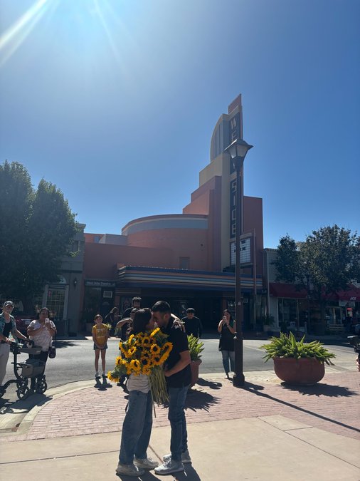 As Munoz stepped out of the salon, she was greeted by the first of many familiar faces holding a sunflower and playing “How Does She Know” from Disney’s Enchanted. It was the first clue in a carefully choreographed proposal that would unfold along a stretch of downtown Newman, lined with 40-plus friends, family members, and students, each handing her a sunflower—her favorite flower—as she made her way toward the West Side Theatre.