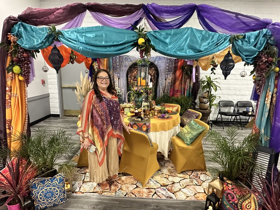 Among the most elaborate displays was “Mediterranean Delights,” created by Annette Michaels and her sister Jeneen Vaughn. Inspired by a birthday celebration Michaels once hosted, the table resembled a lavish Bedouin tent, complete with a hookah, genie lamp, water fountain, and a spread of regional treats including baklava, dates, and pistachio cookies.